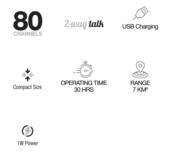 The ADV10-2 series provides adventurers with clear, uninterrupted radio transmission from 80 UHF channels. Users can enjoy up to 7+ hours talk time before recharging via the convenient and cost-saving USB Charging using the included rechargeable batteries.