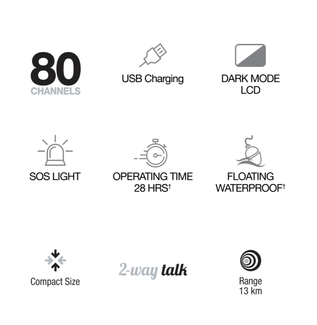 * Please note: CH 22 & 23 are used for telemetry and telecommand applications, voice communications are not permitted on these channels and transmission is inhibited. CH 61, 62 & 63 are guard channels and are unavailable for use.# Up to 13km – Line of Sight.† Waterproof: Rated to IP67, defined as protected against dust ingress, and able to withstand immersion in water up to 1m depth for 30mins.^ Up to 28hrs – Based on Duty Cycle TX 5%, RX 5%, Standby 90% with Alkaline Batteries in low power setting.Operates with 3 AA Rechargeable NiMH (included) or 3 AA standard Alkaline Batteries per individual unit (not included). Do not mix old/new/alkaline/NiMH batteries. Specifications subject to change without notice.