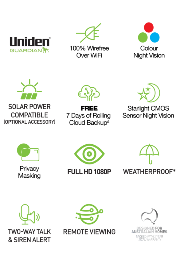 Live and recorded footage can be viewed using the Uniden SOLO App via a smart device, securely accessed from anywhere in the world. Footage can be stored directly to SD card or the Uniden Cloud ensuring important moments are captured and available to replay when required. The camera also has privacy masking to black out areas within the camera’s view that users do not want recorded.