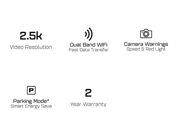 *Parking mode works only with the included Hard Wire Kit and when the car and the unit has been powered off, this mode turns on the unit if it detects vibration. The unit must have sufficient external power supplied in order to record and the G Sensor must also be turned on. #32GB is the maximum capacity Micro SD Card (32GB card included), Uniden recommends using UHS-II cards with UHS Speed Class rating with minimum class 10 for minimum write performance of 10 MB/S. † Image on packaging is for illustration purposes only. Captured footage is dependent on the position and location of the vehicle dash cam &/or rear/reverse camera. ^2.5k (2560 x 1440) video resolution, 5 Megapixel Sony Starvis Sensor.