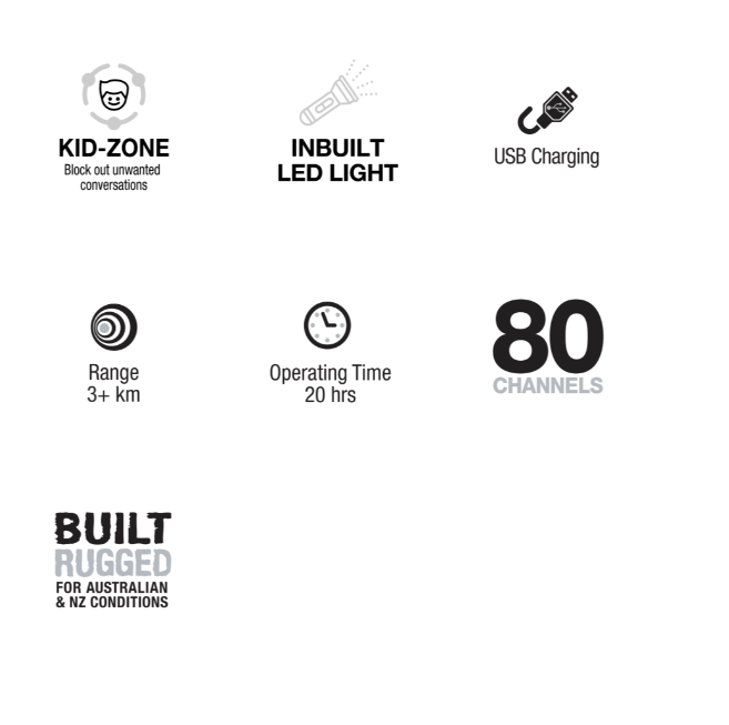 The UH45 series introduces a new Kid-Zone feature to UHF communication – allowing parents to block out unwanted conversations so kids can use the UHF radio with family and friends. Another handy addition to the UH45 Series is the introduction of an inbuilt LED Light, ideal for camping.