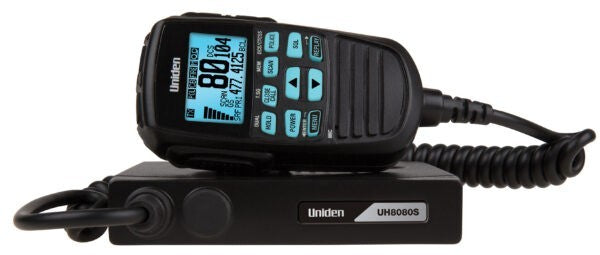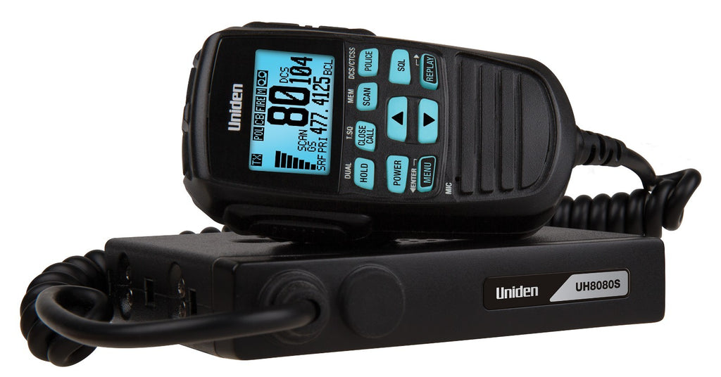 Introducing the latest in UHF Communications from the world leaders in wireless communication. The UH8080S is a remote head UHF Mobile with large LCD Display solution ideal for drivers of 4WD and Motorhomes where size is an issue. The Remote head unit can be mounted on the roof or dash of inside the vehicle and features Instant Replay allowing you to record and replay up to one minute of recent received signals ensuring important transmissions are not missed. The UH8080S is the ultimate in compact UHF communications and built for rugged Australian and New Zealand conditions. Uniden’s reliability and experience in UHF makes this unit ideal for the professional who needs to keep in touch with the outside world. The UH8080S offers the finest components, engineering and styling, just what you would expect from Uniden. The latest innovation added to the Uniden UHF range, Master Scanâ„¢ technology, is designed to ensure minimal disruptions for continuous communication. This premium feature also has Dynamic Switching, which lets users retain constant communication by changing over to unused channels. This network scan function searches for other radios that share the same CTCSS or DCS tone. When the radio detects a signal with no code or an incorrect code, it switches to an unused channel when transmitting. By scanning only group channels, radios in the network will be able to detect and receive group transmissions, offering continuous communication without interruption. The UH8080S is a 5W unit with Flip LCD Display & Mounting and 7 Colour LCD / Backlit Options The UH8080S is equipped with 100 Extra Receive Only Channels and with the Bearcat Engine inside allows you to scan to unencrypted analogue police / fire / & ambulance frequencies. 1Within 400-520 MHz band only. This scanner can only listen to and receive unencrypted analogue transmissions # Range: 18kms Typical Range in kms (line of sight) Specifications subject to change without notice.