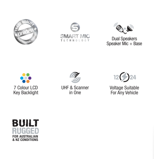 Built for rugged Australian and New Zealand conditions, the UH9000 compact size makes it ideal for the truck drivers, 4WD Drivers, and Caravan Drivers where it can be installed anywhere in the vehicle. Uniden’s reliability and experience in UHF makes this unit ideal for the professionals who needs to keep in touch with the outside world. The UH9000 is not only a CB Radio but has a built in Scanner with over 100 Extra receive only channels to pick up important frequencies.