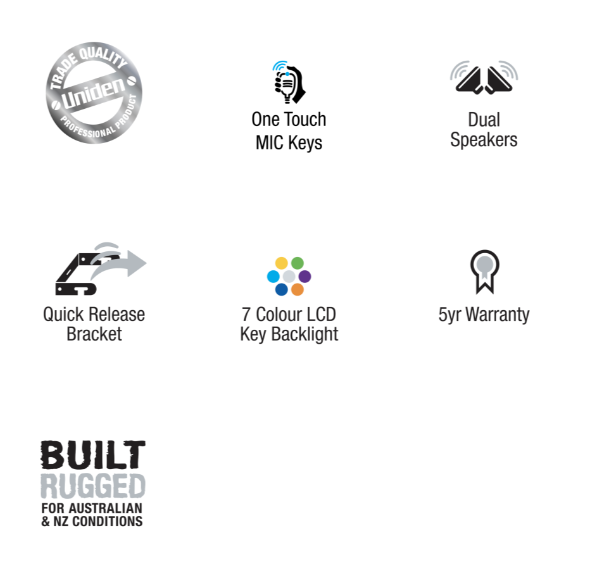 The X70 is the ultimate in compact UHF communications with a trade quality build and engineered for rugged Australian and New Zealand conditions makes it ideal for the truck drivers, 4WD Drivers and Caravan Drivers. Uniden’s reliability and experience in UHF makes this unit ideal for the professional who needs to keep in touch with the outside world. The X70 offers the finest components, engineering and styling, just what you would expect from Uniden.