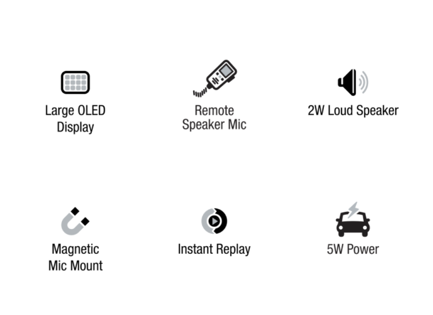 The XTRAK 80 Pro has a large, high contrast anti-glare OLED display and backlit keypad on the in-vehicle UHF radio is clear and easy to read in all lighting conditions. It also contains a Powerful integrated 2-Watt speakers and 4 level voice enhancer enable maximum sound clarity in noisy environments. And the XTRAK 80 Pro connects through Bluetooth to your car audio speakers.